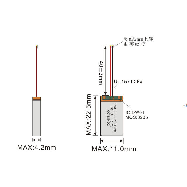 Nom du produit:Batterie rechargeable lithium-polymère 3,7 V 401020 Li-Po, petite taille