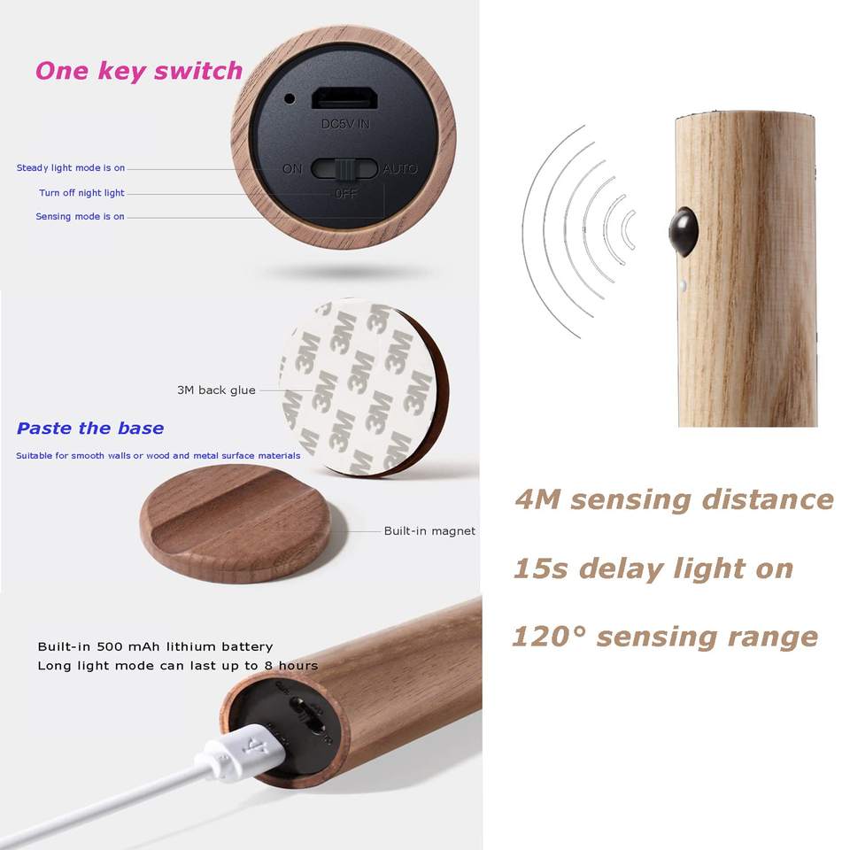 Lampe de nuit LED à détecteur de mouvement magnétique rechargeable, sans fil, à fixer au mur, pour chambre, couloir, escalier, placard