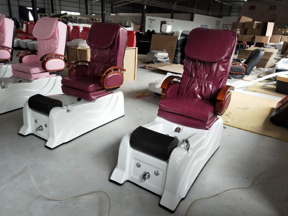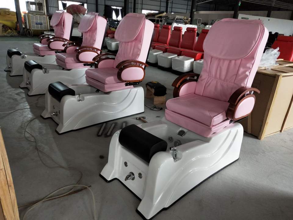 Fauteuil de pédicure inclinable et réglable, vibration, matériau PU rose, système de jets sans tuyau, massage chauffant, lampe LED 7 couleurs pour salon de manucure