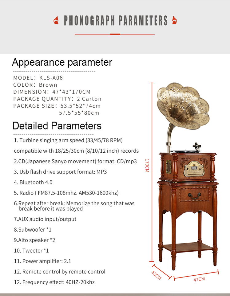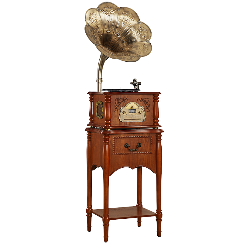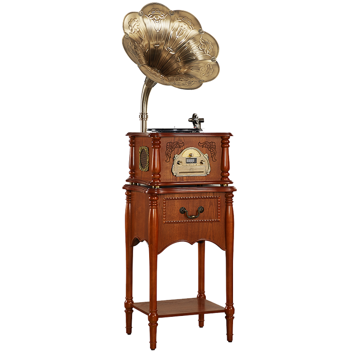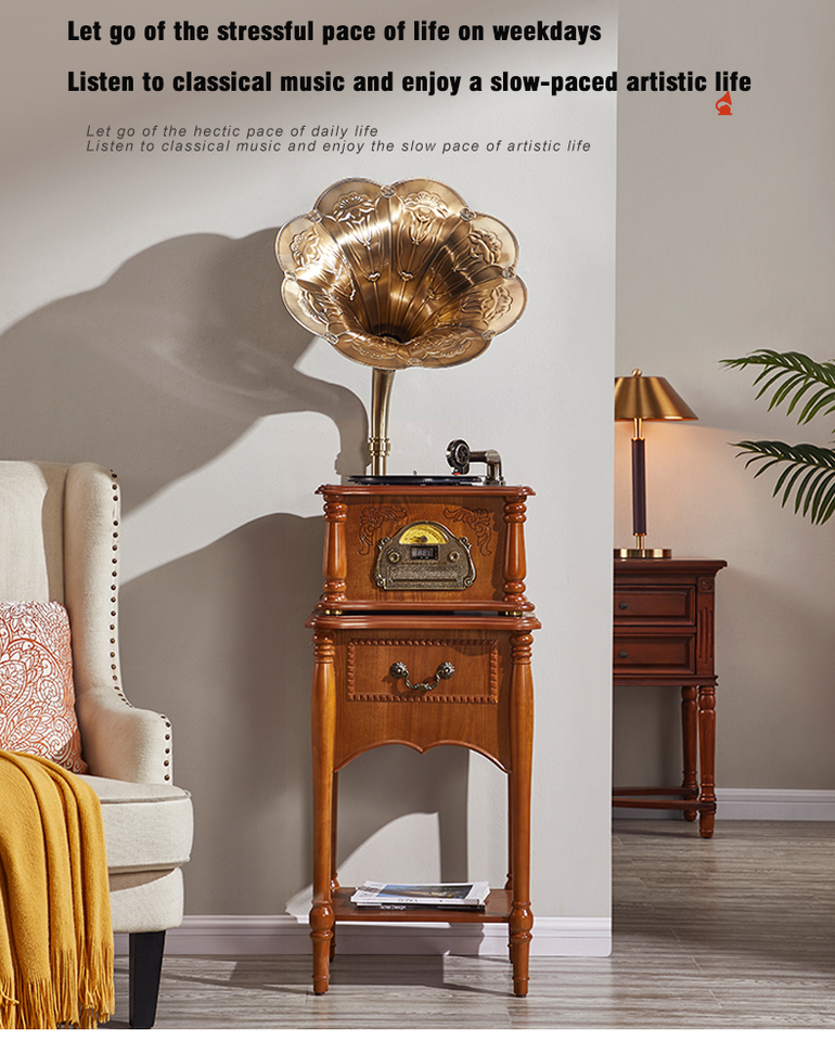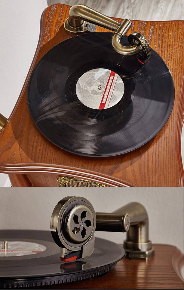 Platine vinyle rétro tout en un phonographe vintage pour LP avec corne en cuivre, haut-parleur intégré Aux-in/USB