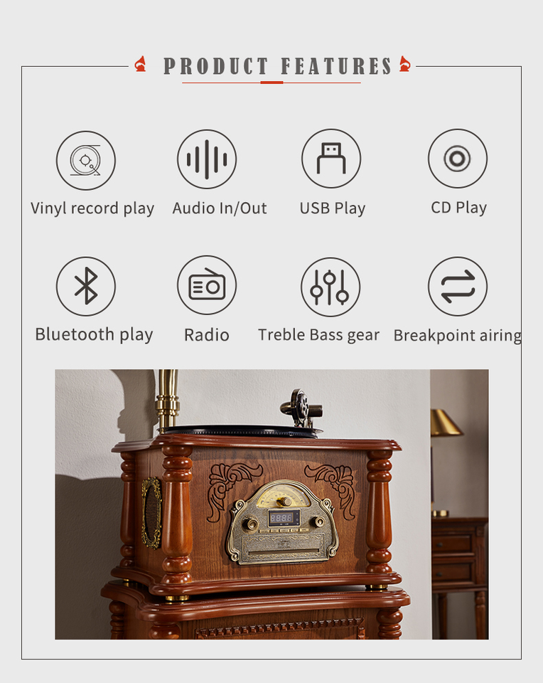 Disques vinyles, CD, Bluetooth, Lecture USB, Carte TF, Radio FM