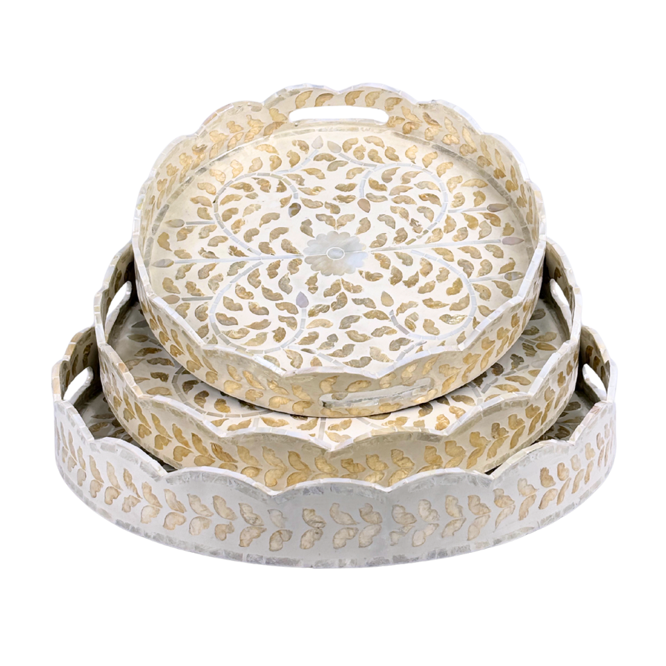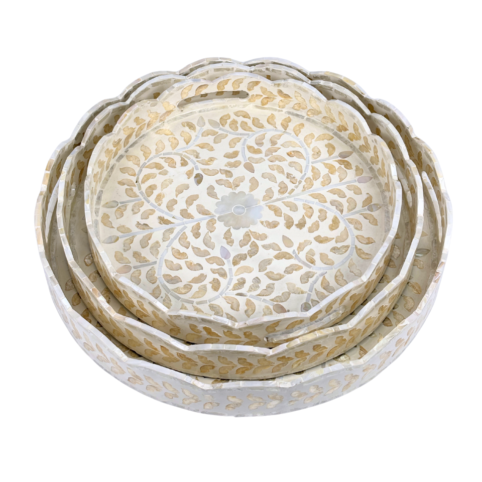 Ensemble de plateaux rectangulaires en MDF pliables, avec incrustation de nacre de Capiz festonnée et motif feuille, faits main, durables, classiques, pour le salon