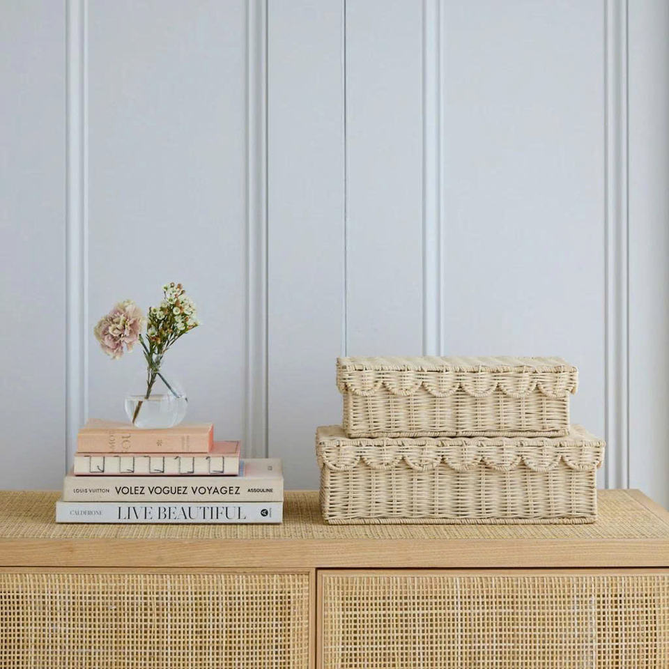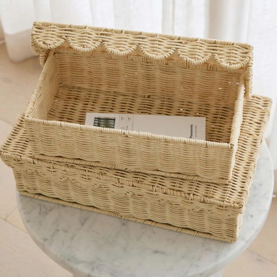 Coffre de rangement rectangulaire en osier festonné avec couvercle à charnières - Organisateur artisanal en rotin naturel pour les essentiels de bébé