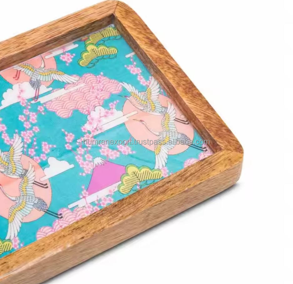Plateau de service en bois en forme de rectangle Plateau d'assiette de service imprimé en bois de mangue et émail au meilleur prix Meilleur prix de gros
