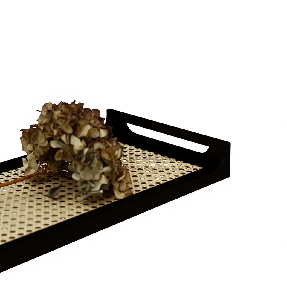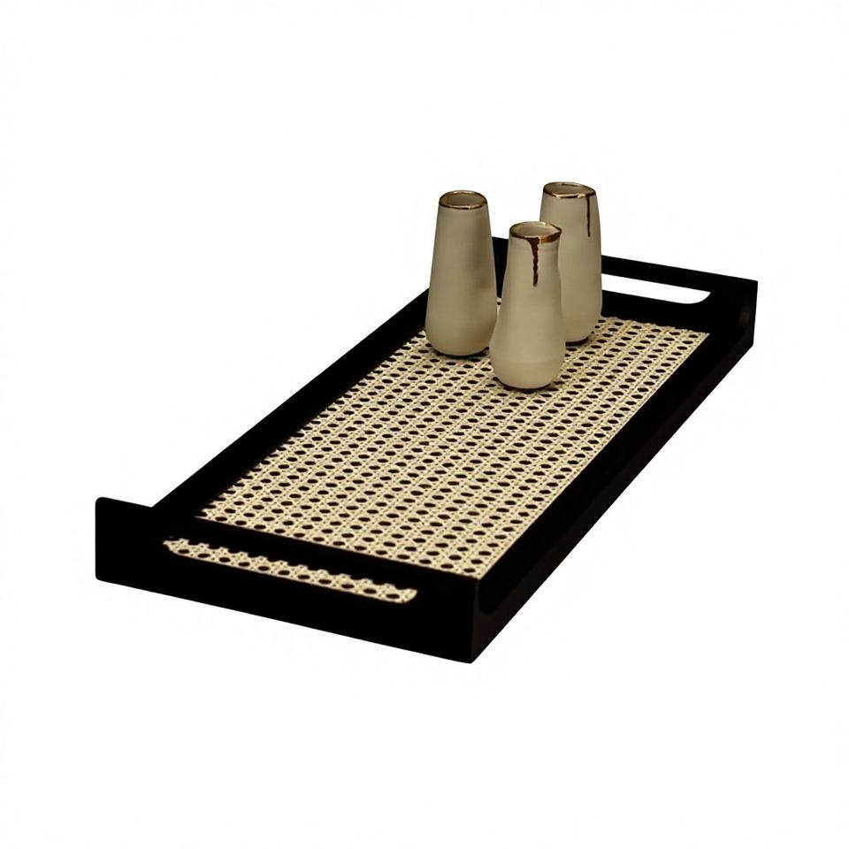 Plateau de service rectangulaire en bois, design imitation rotin, MDF noir. Idéal pour la décoration intérieure. Plateau en MDF imitation rotin pour la décoration de la maison. Craftera exporte.