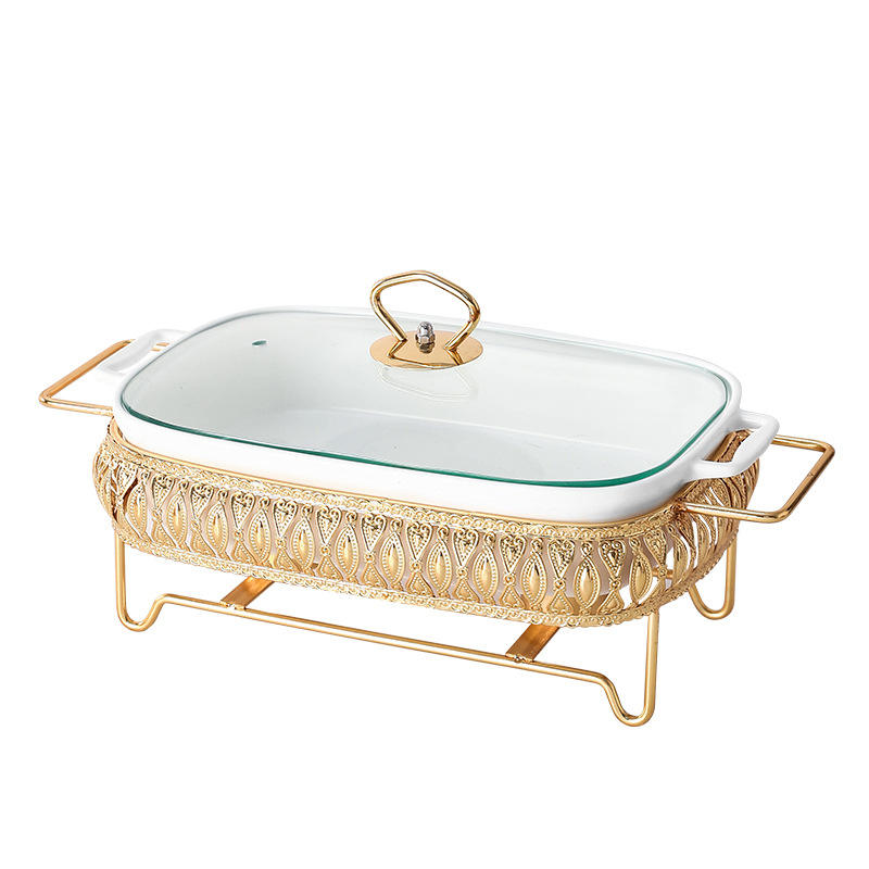 Plat en céramique rectangulaire Plat de cuisson Vaisselle Chauffe-plat Plat à soupe avec support doré