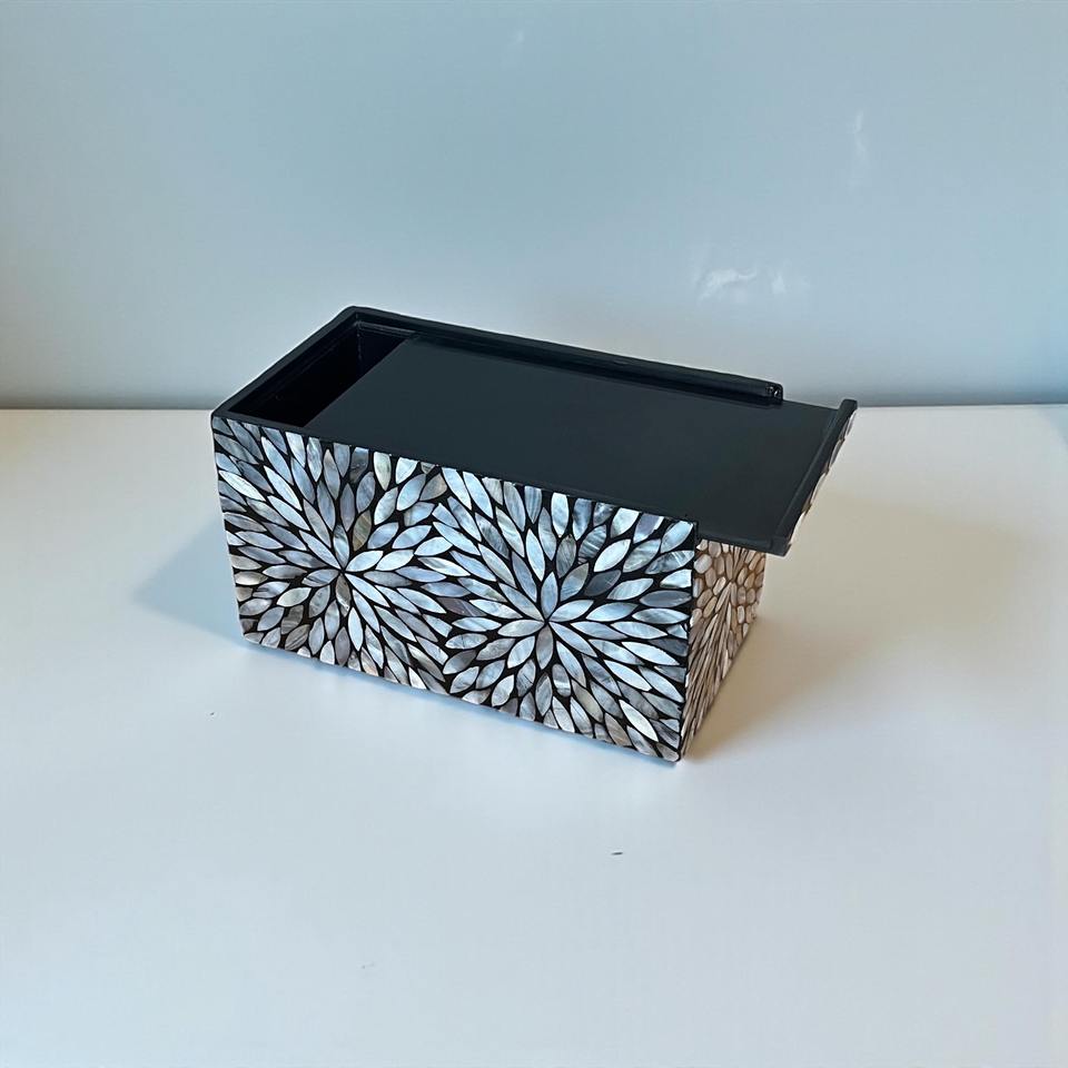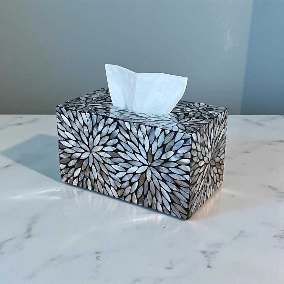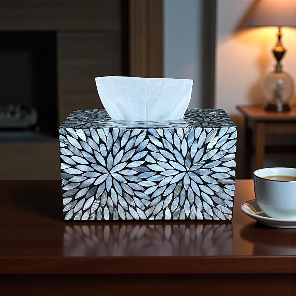 Boîte à mouchoirs rectangulaire avec incrustation de nacre et motif floral flocon de neige, idéale pour la décoration de table et de comptoir de luxe