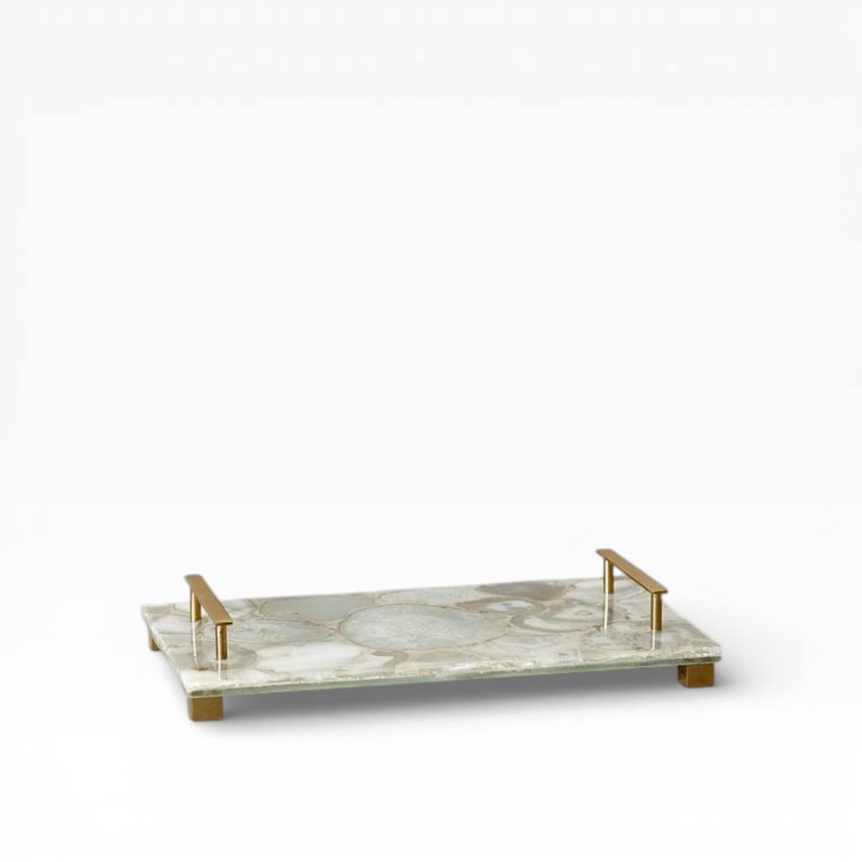 Plateau de service rectangulaire en agate naturelle neutre avec motif de cristal superposé et pieds en or minimal