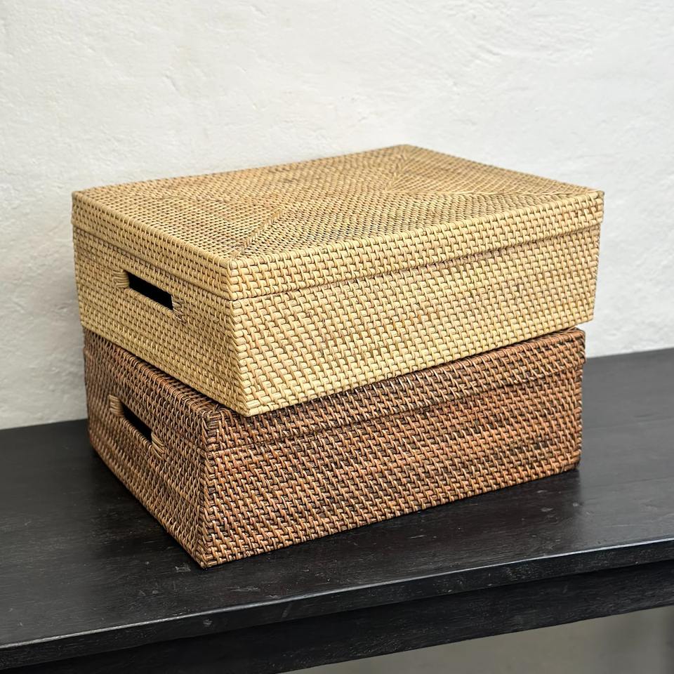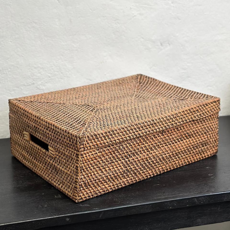 Nom:Boîte de rangement rectangulaire en rotin avec couvercle. Dimensions : L15,7 x L13,8 x H8 pouces.