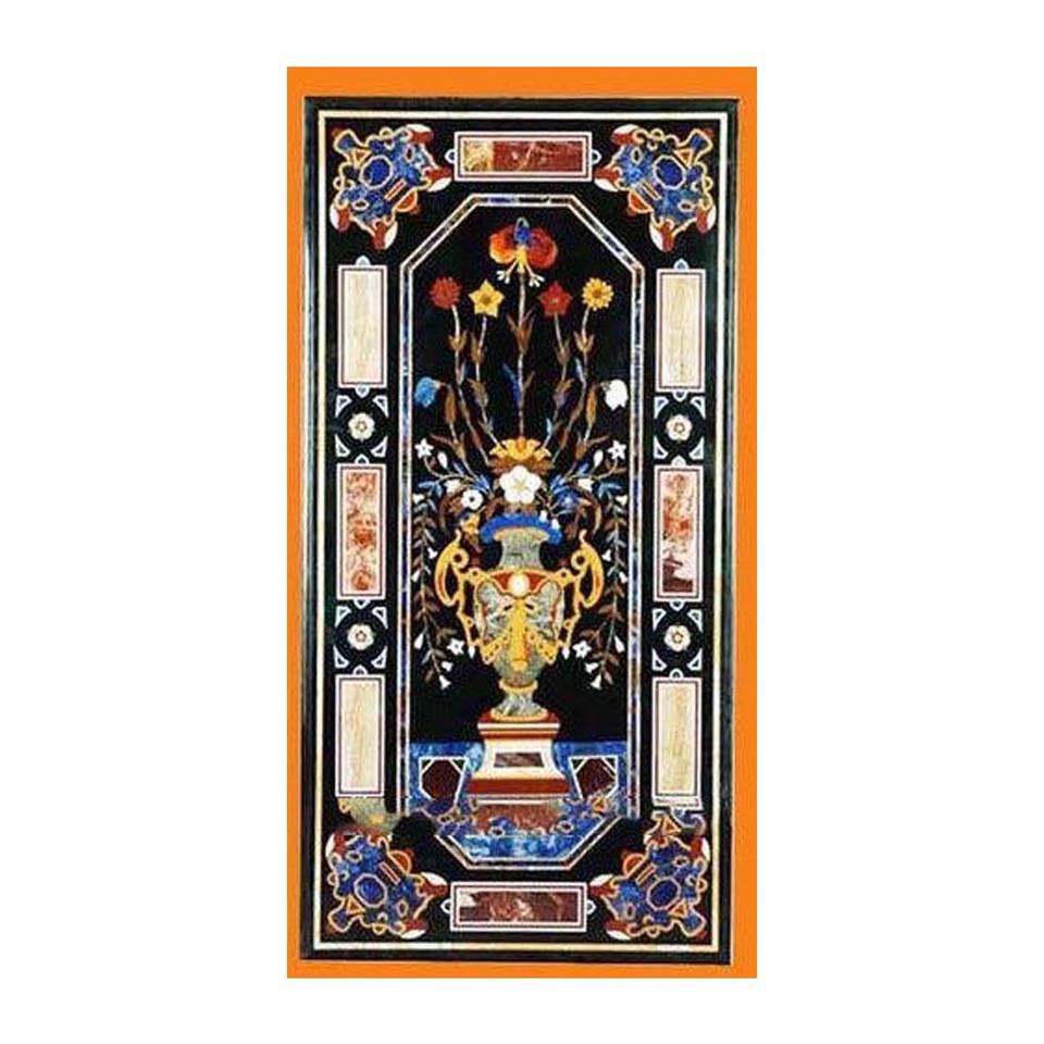 Table de salle à manger rectangulaire en magnifique marbre avec incrustations de différentes pierres.