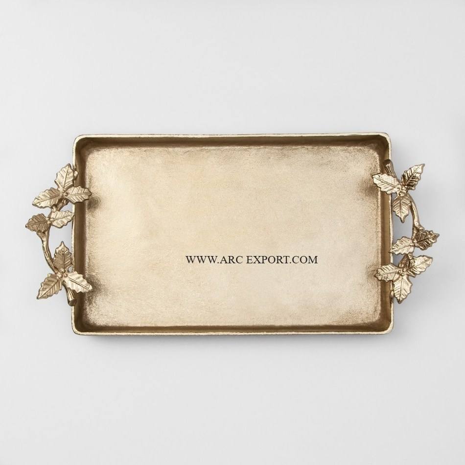Plateau alimentaire en aluminium doré de forme rectangulaire avec poignées en forme de feuille