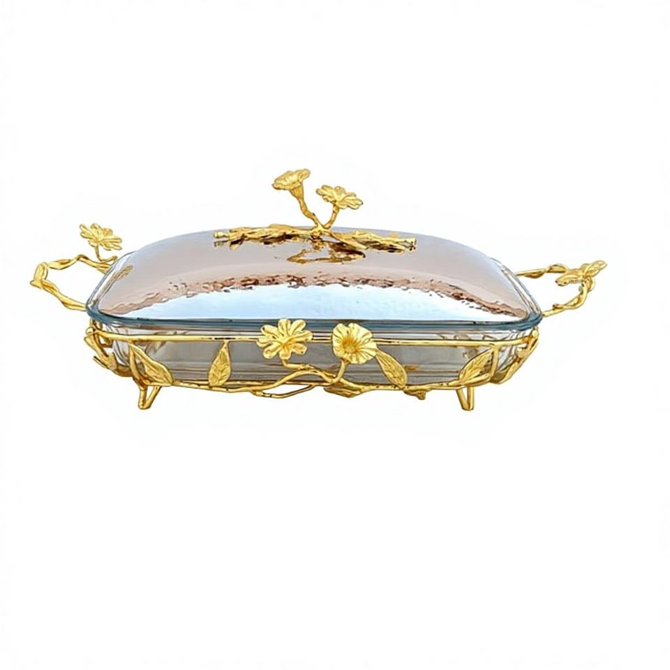 Plat de service rectangulaire en acier inoxydable et verre avec accents floraux, plat à riz, couvercle/support personnalisable avec logo – Vente en gros disponible