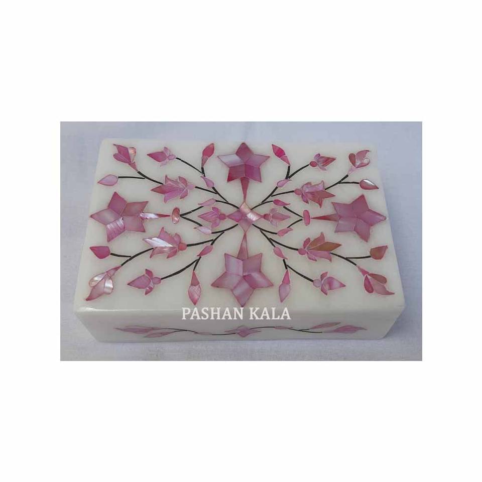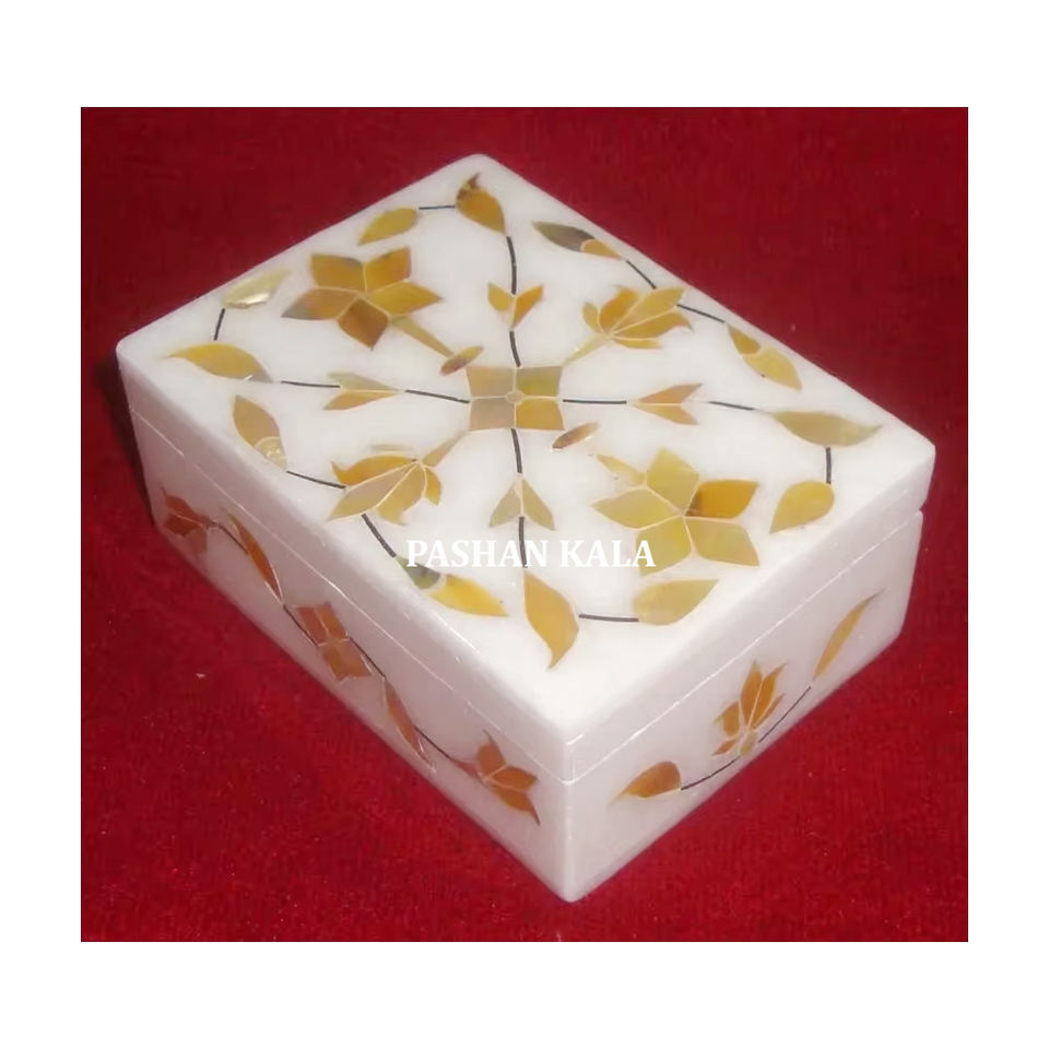 Magnifique boîte de rangement à bijoux en marbre blanc avec incrustations de nacre dorée, design floral, forme rectangulaire, pour le rangement et les cadeaux