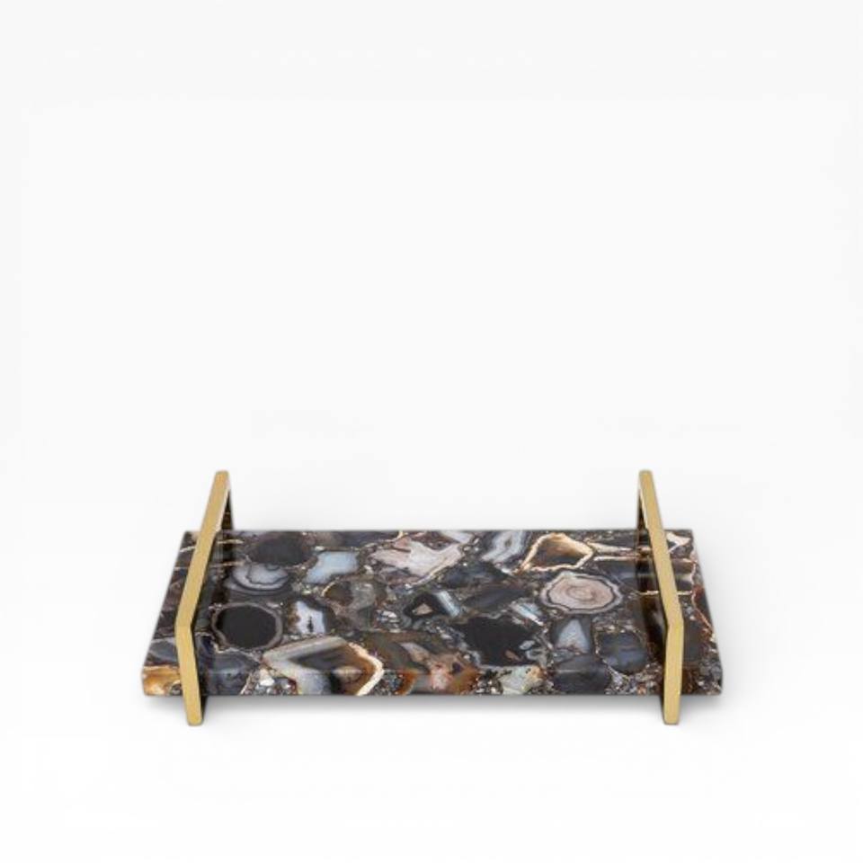 Plateau rectangulaire en agate naturelle blanche avec motif de cristal nuageux doux, base surélevée dorée et poignées métalliques minimales