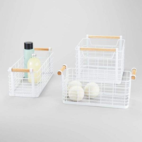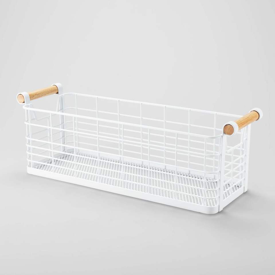 Panier rectangulaire en fil blanc avec poignées en bois naturel, élégant et pratique, accessoire pour la maison ou le bureau