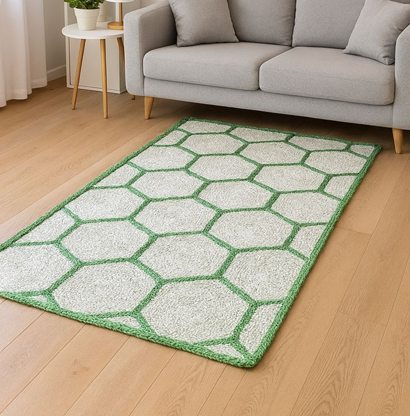 Tapis rectangulaire en jute tissé à motif nid d'abeille hexagonal tressé vert vif, revêtement de sol au prix de gros.