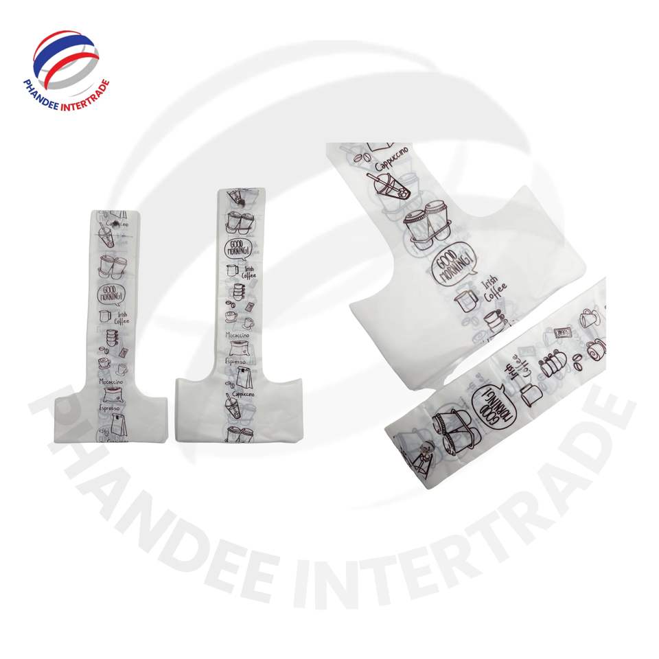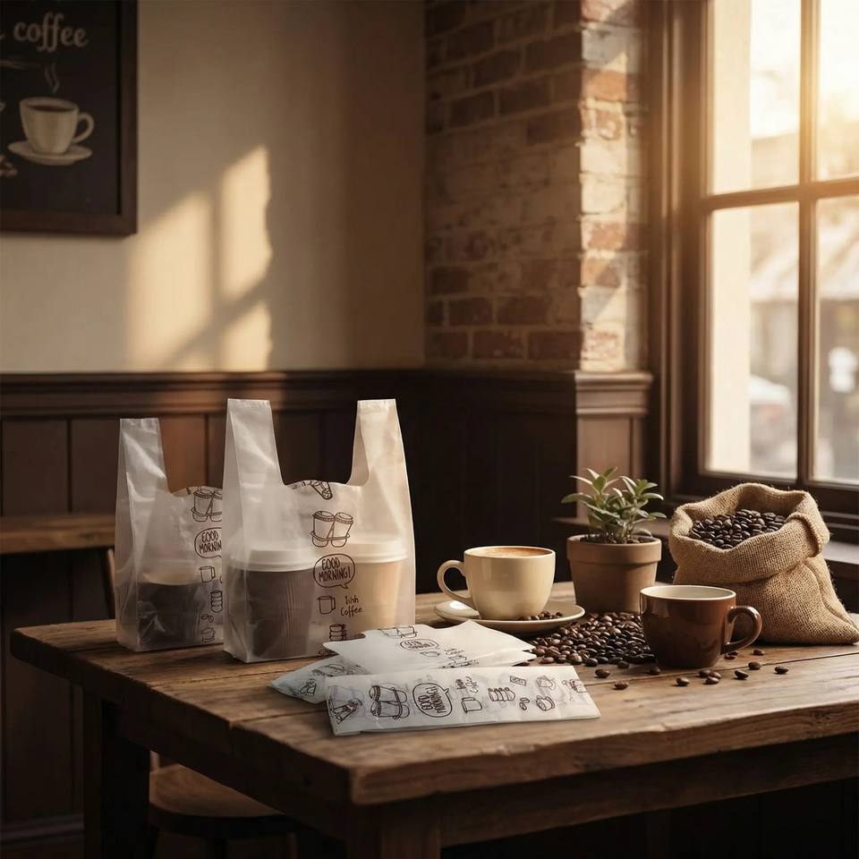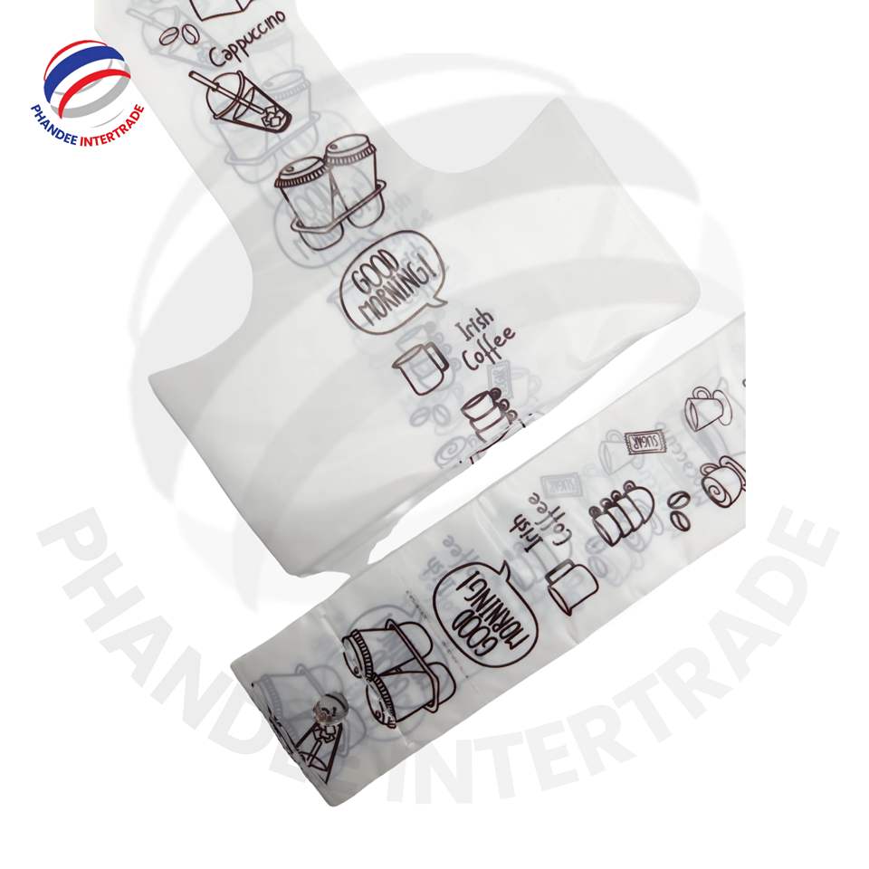 Support et porte-sacs en plastique HDPE recyclable imprimé motifs café et fruits pour gobelets jetables 10/12/14oz 16/22oz 32oz