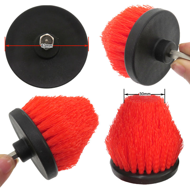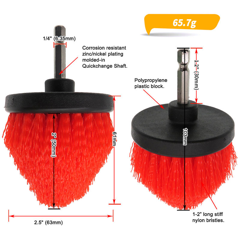 Brosses de nettoyage coniques rouges de 2,5 pouces, tige de 6,35 mm, tête de brosse électrique conique pour le nettoyage domestique et automobile