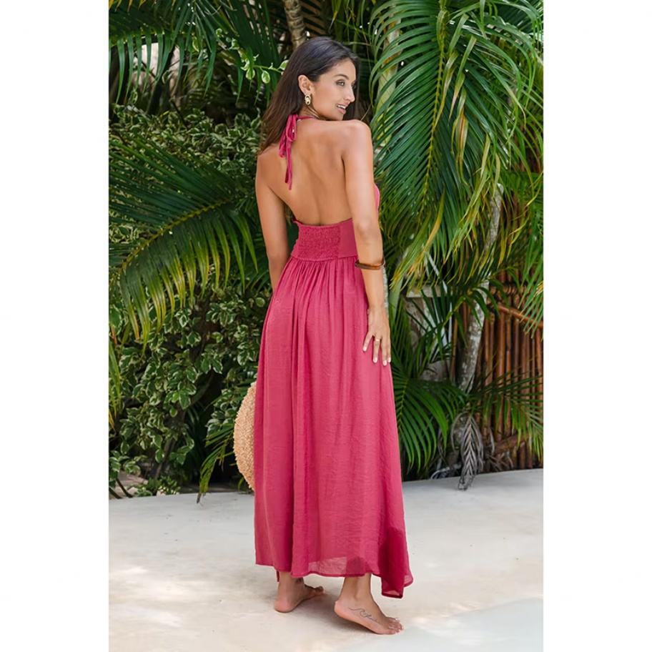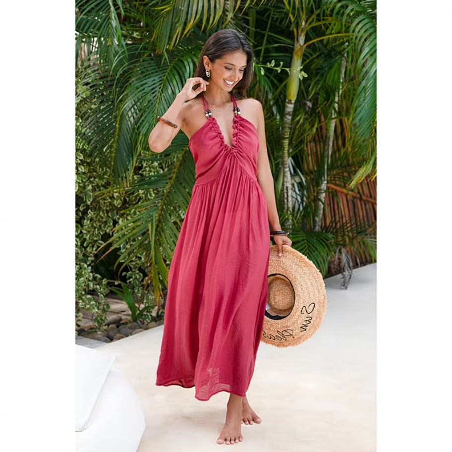 Robe longue dos nu à col halter et perles rouges, style banquet, pour une allure élégante
