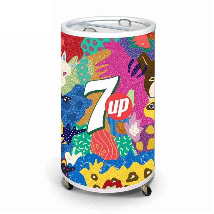 Réfrigérateur Red Bull Round Barrel avec porte en verre personnalisée en forme de canette.