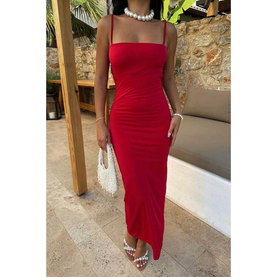 Robe de cocktail rouge avec détail unique au dos