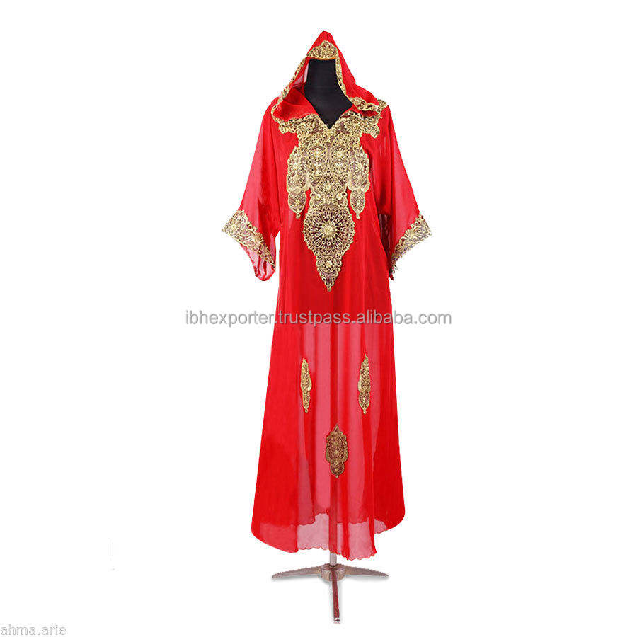 Caftan de femmes musulmanes de couleur rouge avec pierre dorée et perles fonctionnent avec un nouveau style de capuche