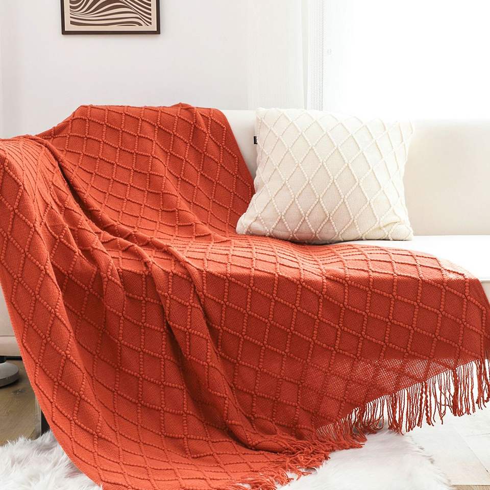 Plaid tricoté à motif losanges rouges avec pompons, doux et confortable, pour lit, canapé et salon