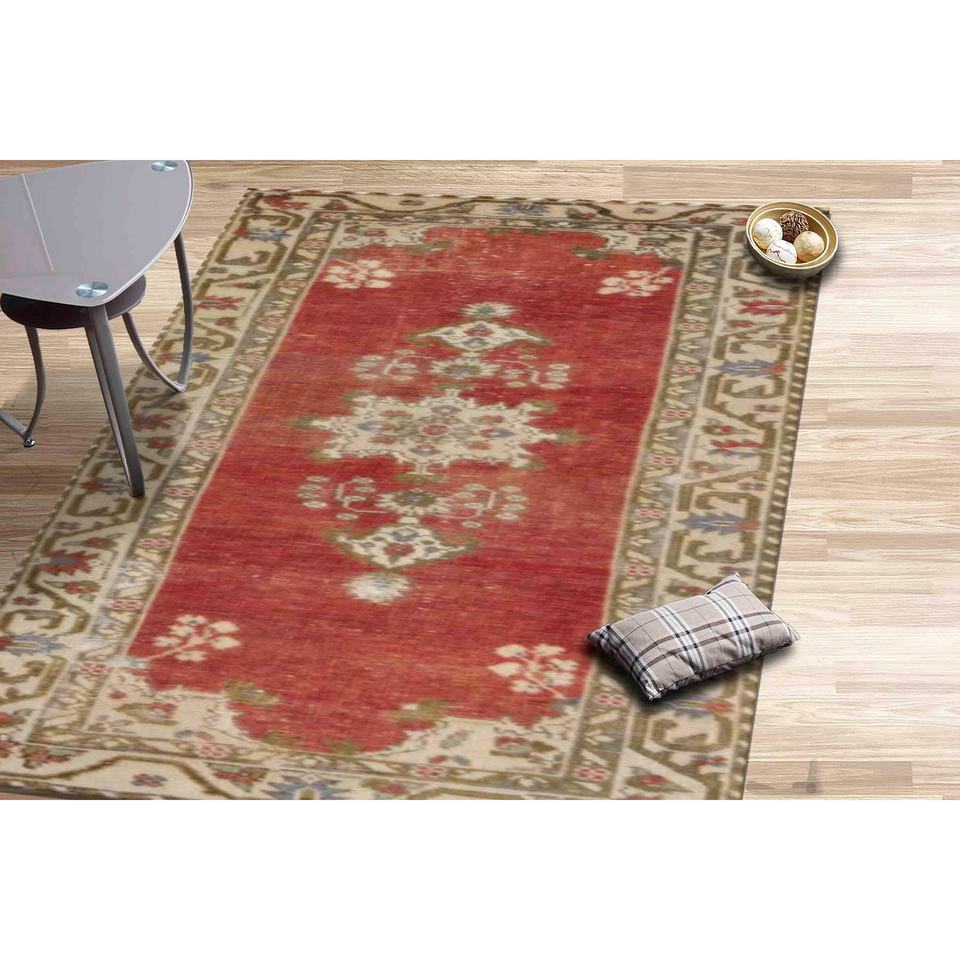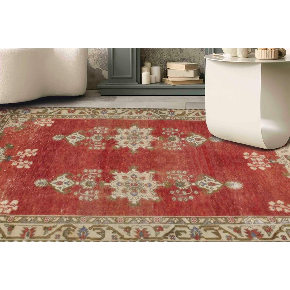 Tapis ethnique anatolien imprimé rouge : design turc vintage, tapis fin non tissé