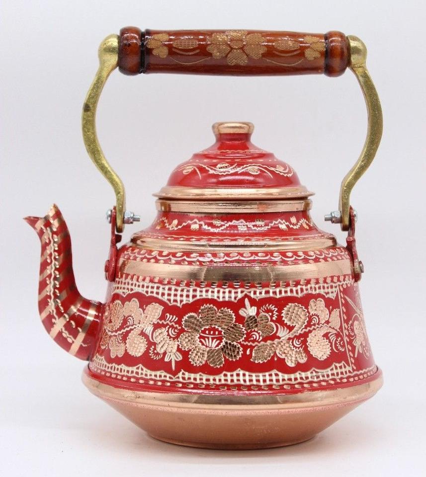 Red Floral Pattern Copper Tea Kettle with Decorative Hand Painted Design Vintage Style Teapot Boiling Water Tea Coffee Stove Top