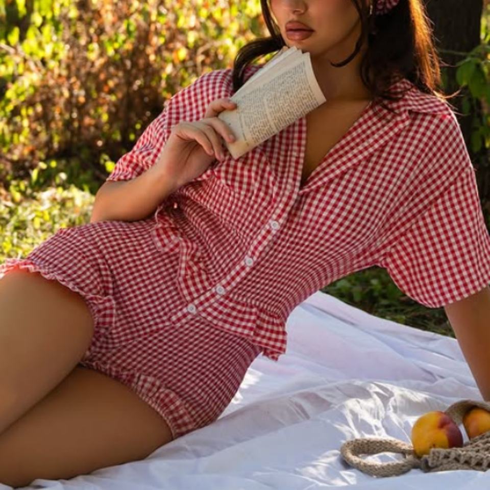 Ensemble deux pièces en gingham rouge pour femmes, chemise à manches courtes boutonnée, ensemble de shorts à volants pour pique-nique d'été