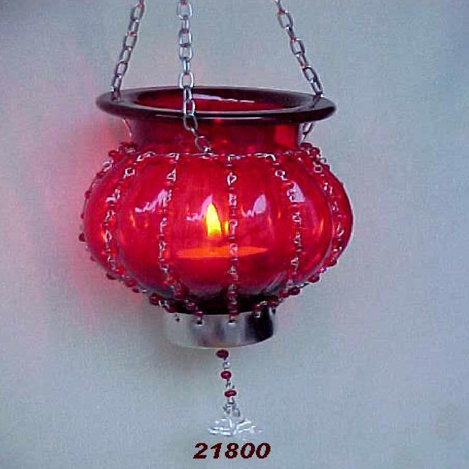Porte-bougie chauffe-plat suspendu en verre rouge et métal, écologique, fait main, pour décoration de Noël, avec perles décoratives luxueuses