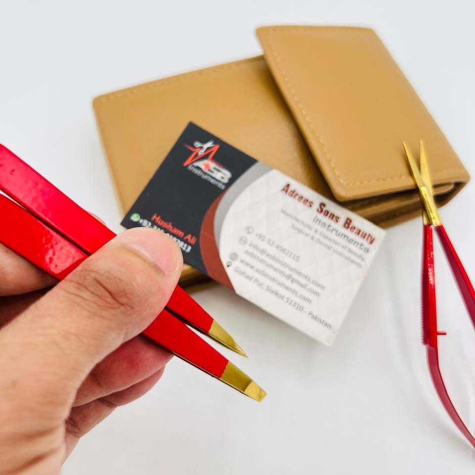 Pince à épiler à sourcils en or rouge pince à sourcils pointue inclinée en acier inoxydable durable personnalisée avec ciseaux à ressort et étui