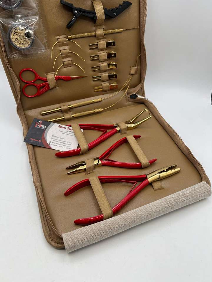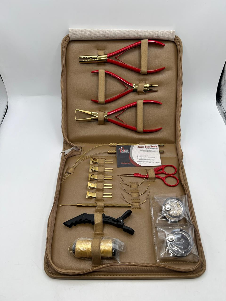 Kit d'outils pour extensions de cheveux en micro-perles rouges et dorées, personnalisable, multifonctionnel, pinces en acier inoxydable, pinces à cheveux, rasoir, aiguille à coudre