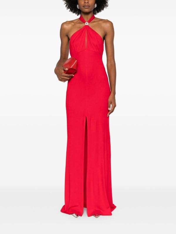 Robe de soirée Maxi trapèze sans manches à col licou rouge avec fente frontale centrale et dos nu design en mousseline de soie antistatique soirée de bal/fête