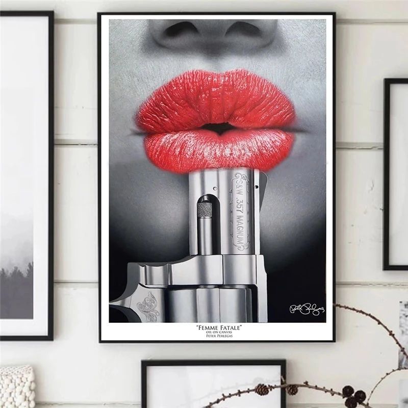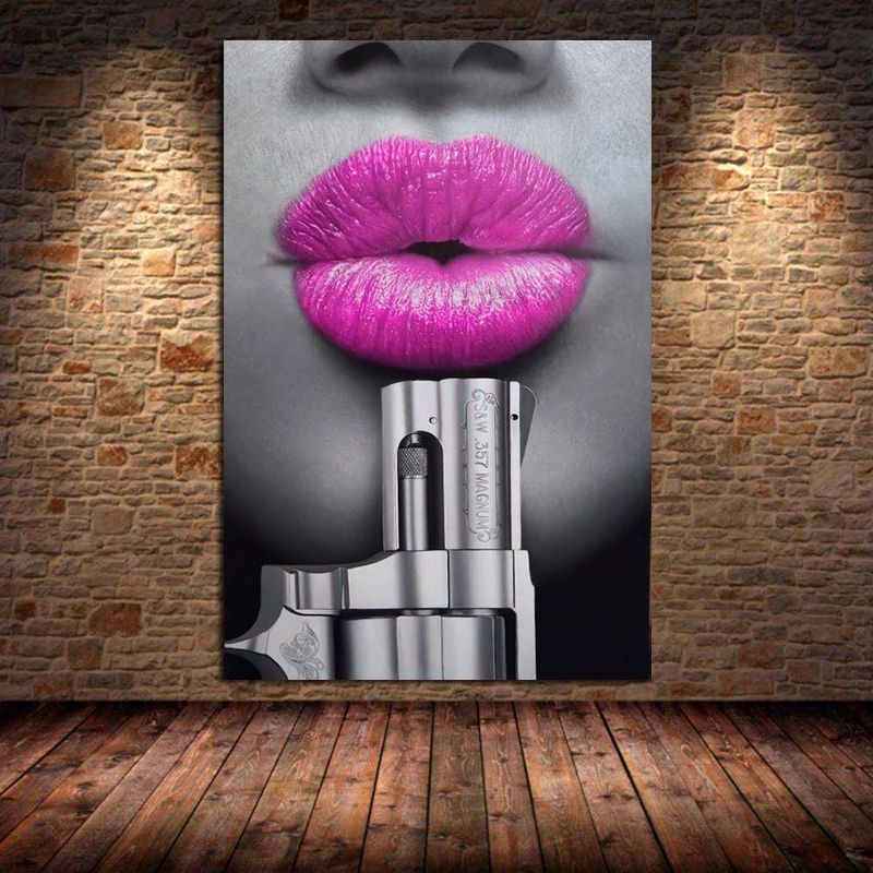Affiche d'art mural avec citation sur les lèvres rouges et un pistolet, peinture à l'huile sur toile, idée de décoration créative pour le salon, le bar, Cuadros