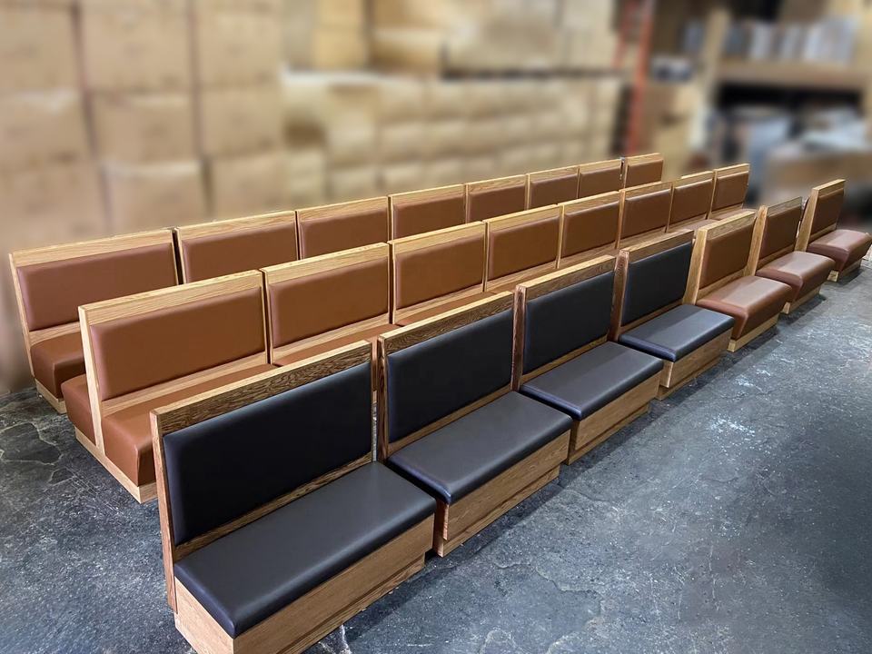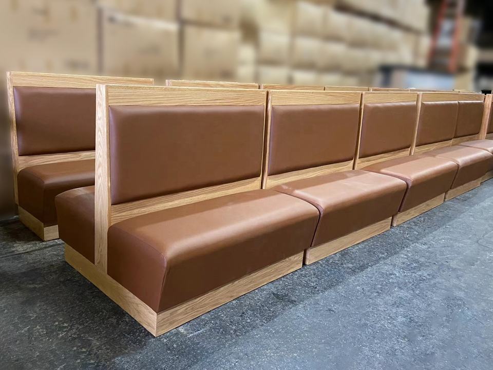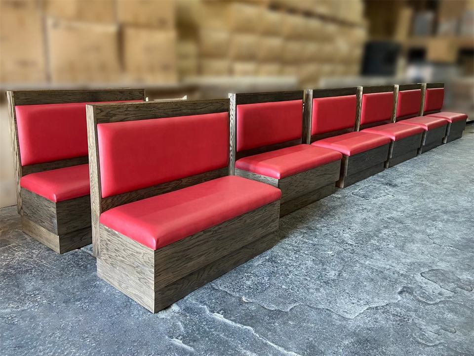 Canapé de restaurant rembourré en cuir PU rouge avec base en bois grainé, banc de salle à manger commercial pour hôtel, bar, mobilier