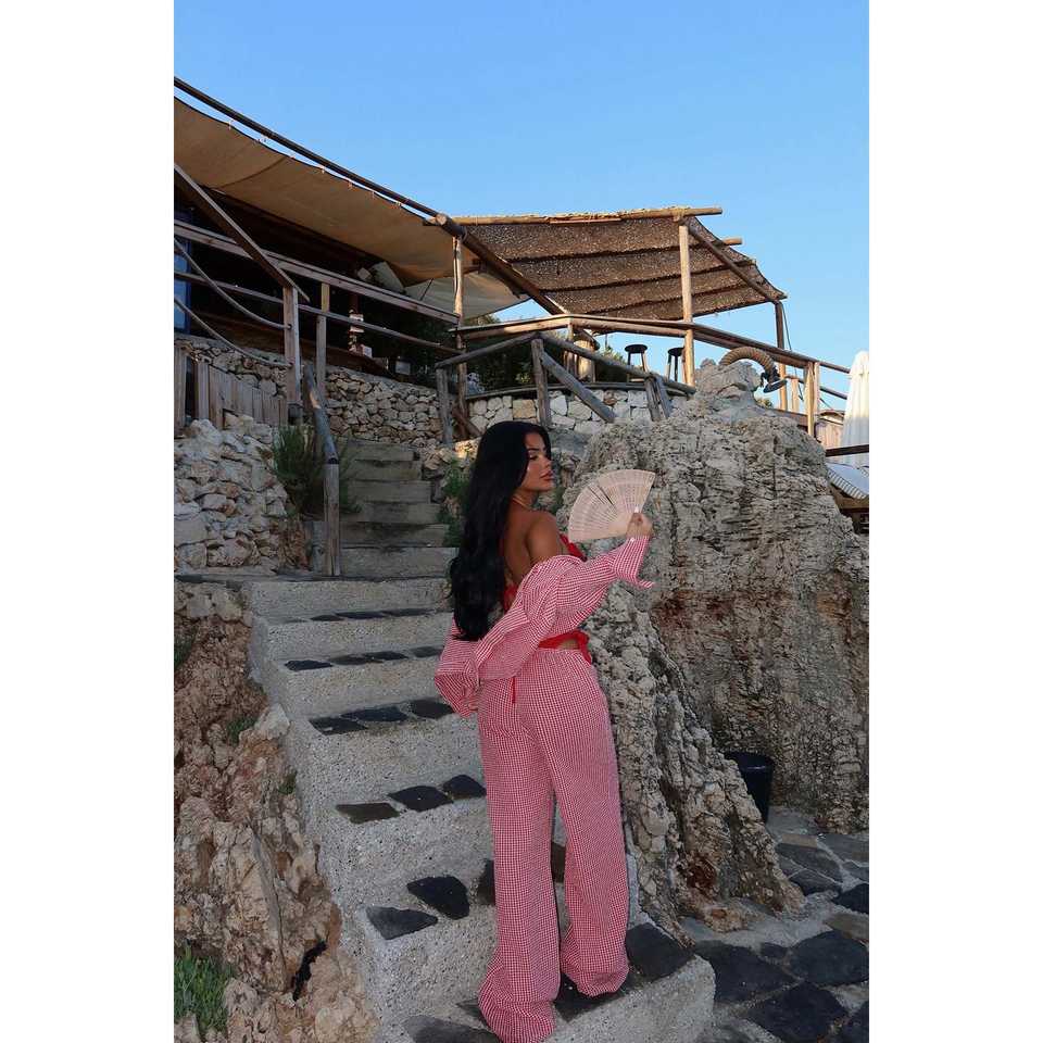 Costume formel à carreaux rouges avec décoration boutonnée, style été
