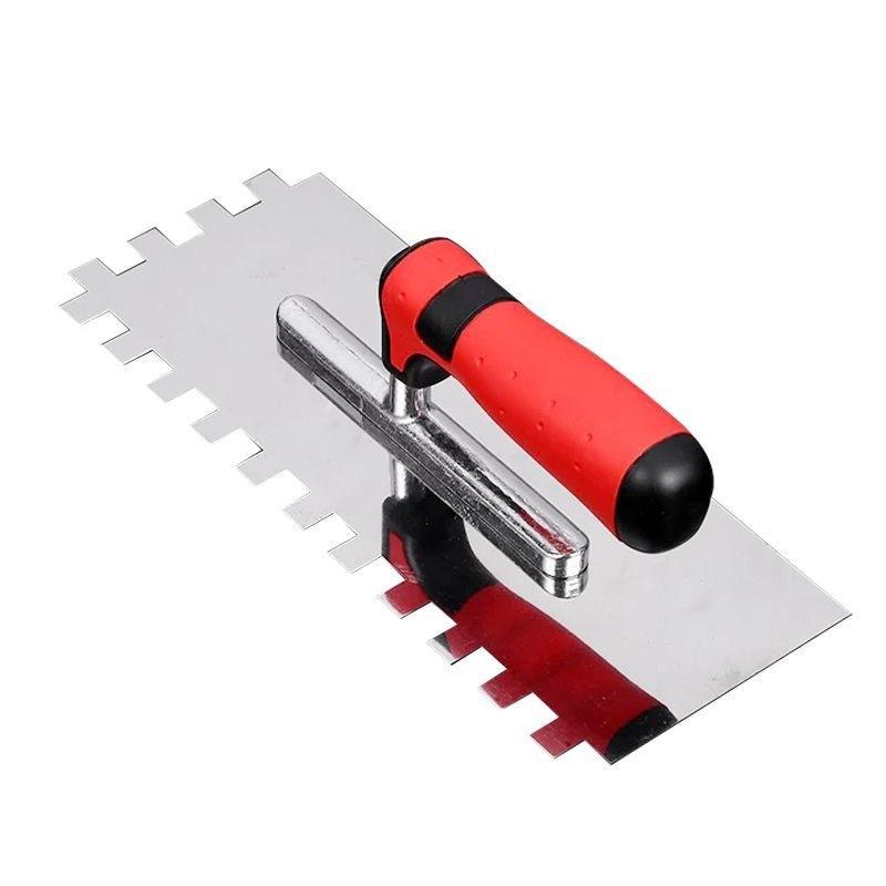 Spatule à plâtrer à lame dentée avec manche en caoutchouc rouge et manche en bois pour la pose de carreaux