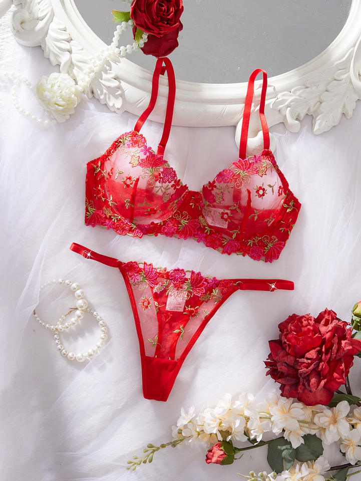 Ensemble de lingerie sexy rouge en dentelle transparente brodée florale avec soutien-gorge push-up pour femmes