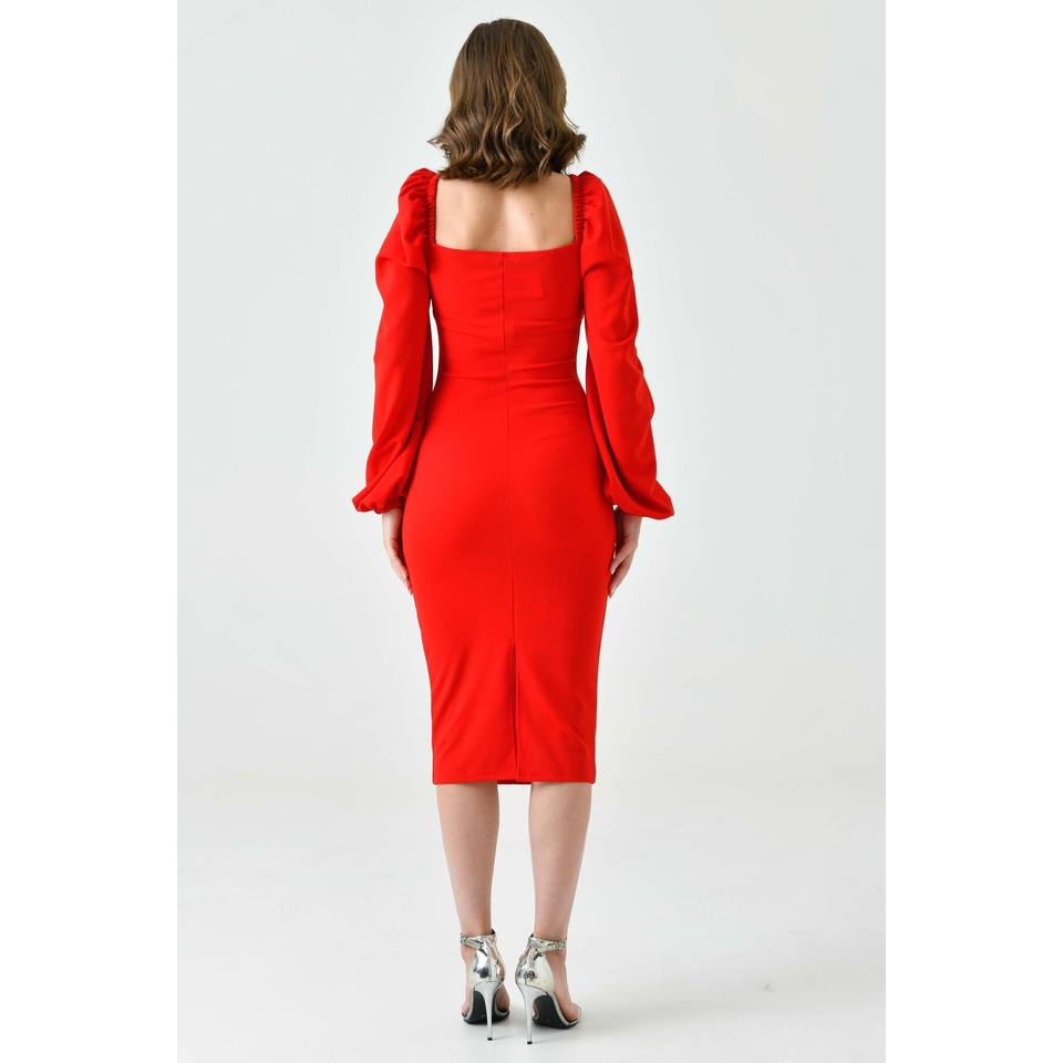 Robe midi rouge en tissu crêpe extensible, col enveloppant, manches ballon et fente