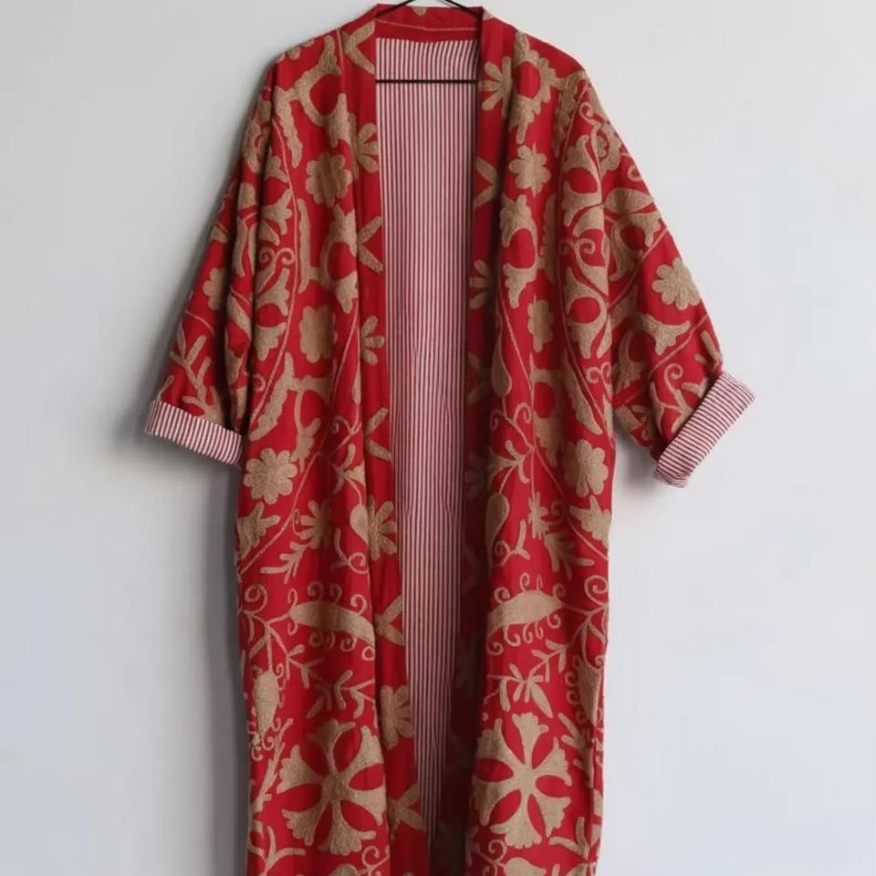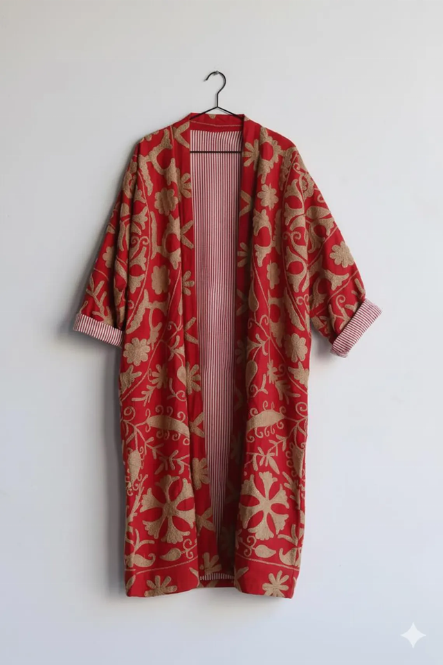 Robe kimono brodée rouge Suzani, broderie traditionnelle d'inspiration ouzbèke, vêtements de détente de luxe, style vintage, manteau
