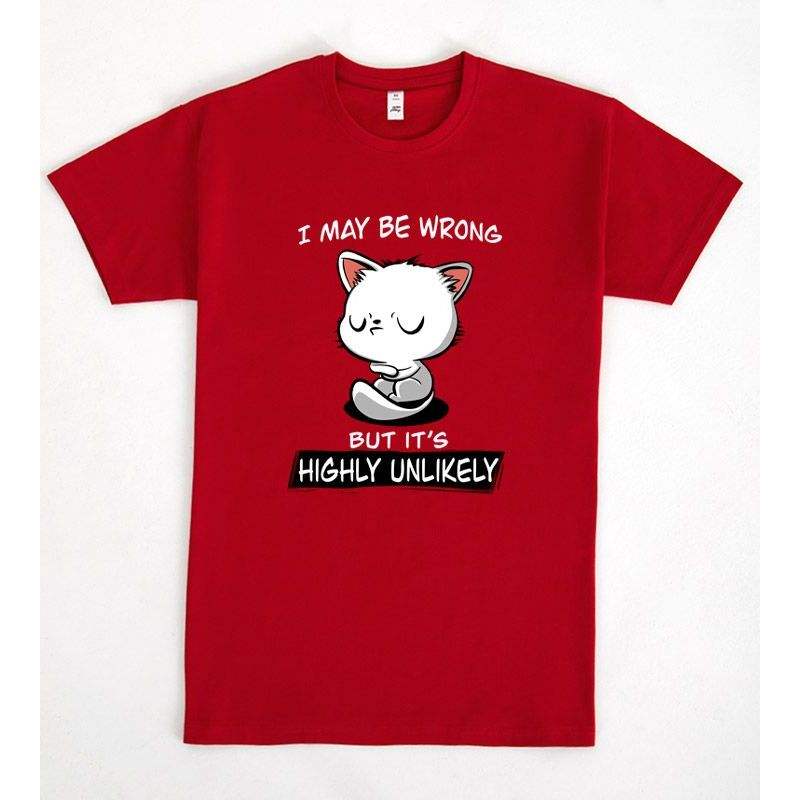 T-shirt rouge avec motif chat « Je peux me tromper, mais c'est très improbable » – Vêtement promotionnel au design original