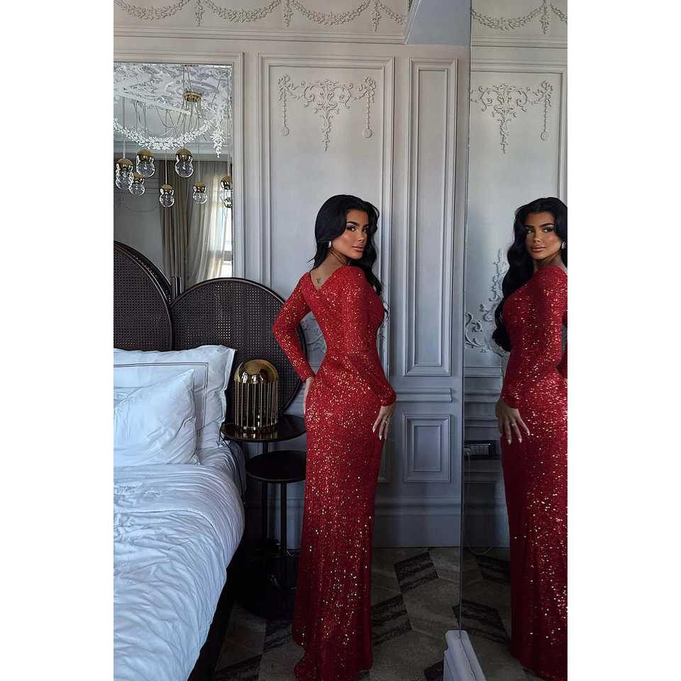 Red Tamera Long-Sleeved Sequin Evening Dress Floor-Length Party Style High Empire Feathers Pearls Flowers for Banquets Weddings