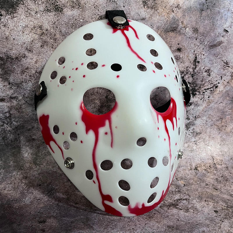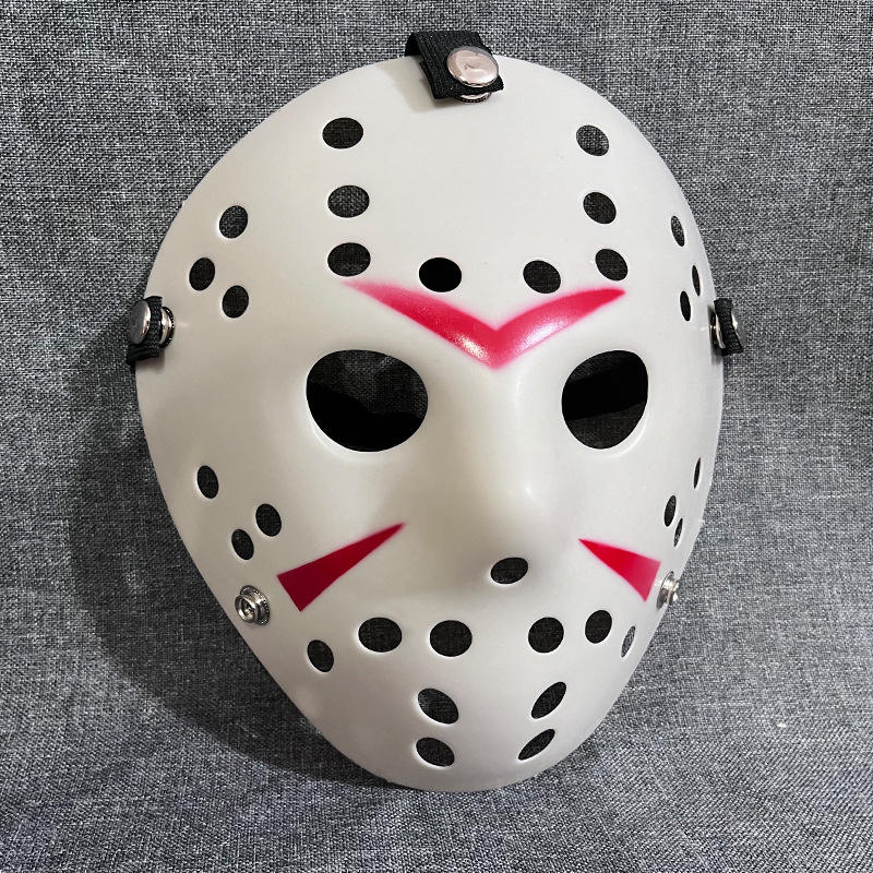 Masque de mascarade d'horreur d'Halloween respirant et écologique en plastique rouge et blanc à motif de dessin animé Jason Voorhees pour les adolescents de 14 à 18 ans
