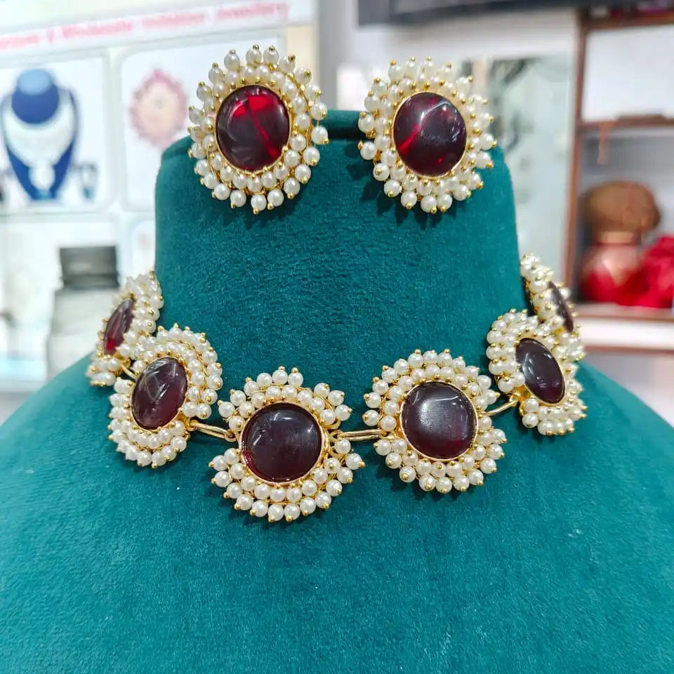 Red Wine Color Choker Manufacturer of AD Brass Necklace Pendent Set Trend for Women's Wedding Party Wear