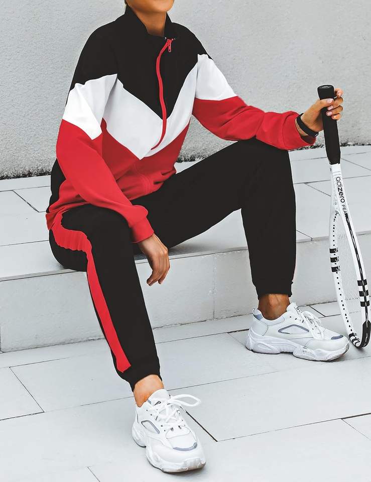 Ensemble de survêtement rouge pour femme, 2 pièces, tenue de jogging à manches longues, fermeture éclair, ensemble de jogging décontracté avec poche