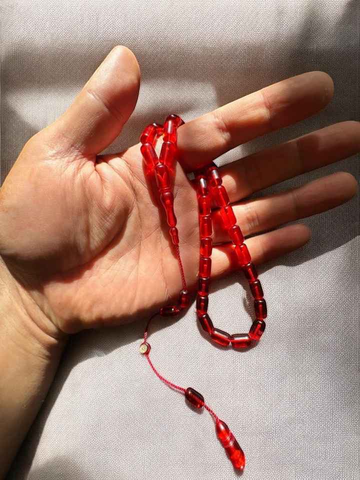 Chapelet islamique Tasbih en résine rouge et jaune écologique, perles de prière découpées en forme de capsule, couleur ambre