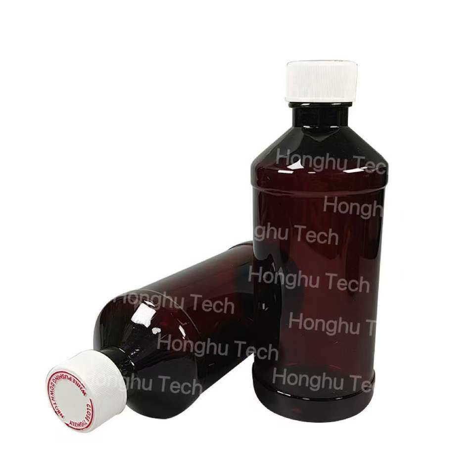 Flacon rond en PET ambré rechargeable de 473 ml, qualité pharmaceutique, avec protection UV pour usage cosmétique et alimentaire