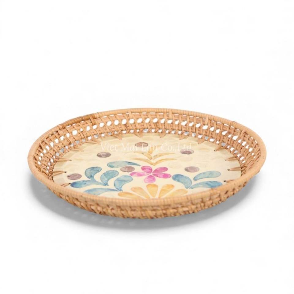 Refined Bohemian Style Mother of Pearl Plate with Natural Rattan Border for Elegant Home Serving Dining Decoration From Vietnam