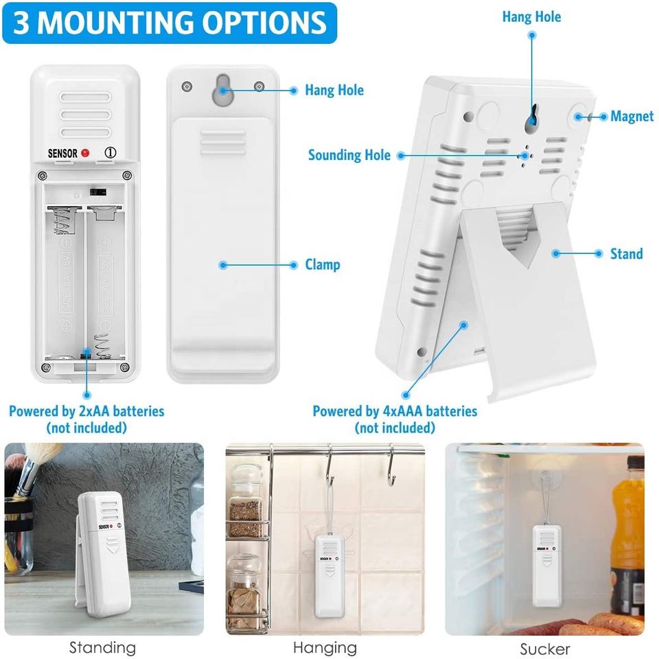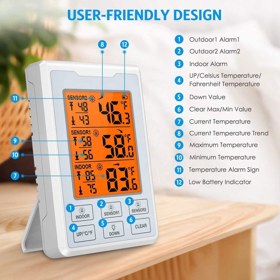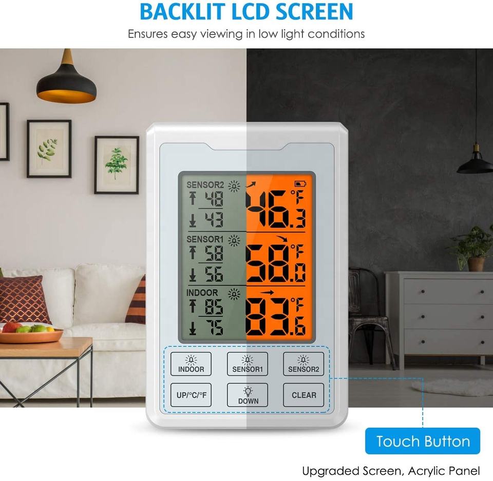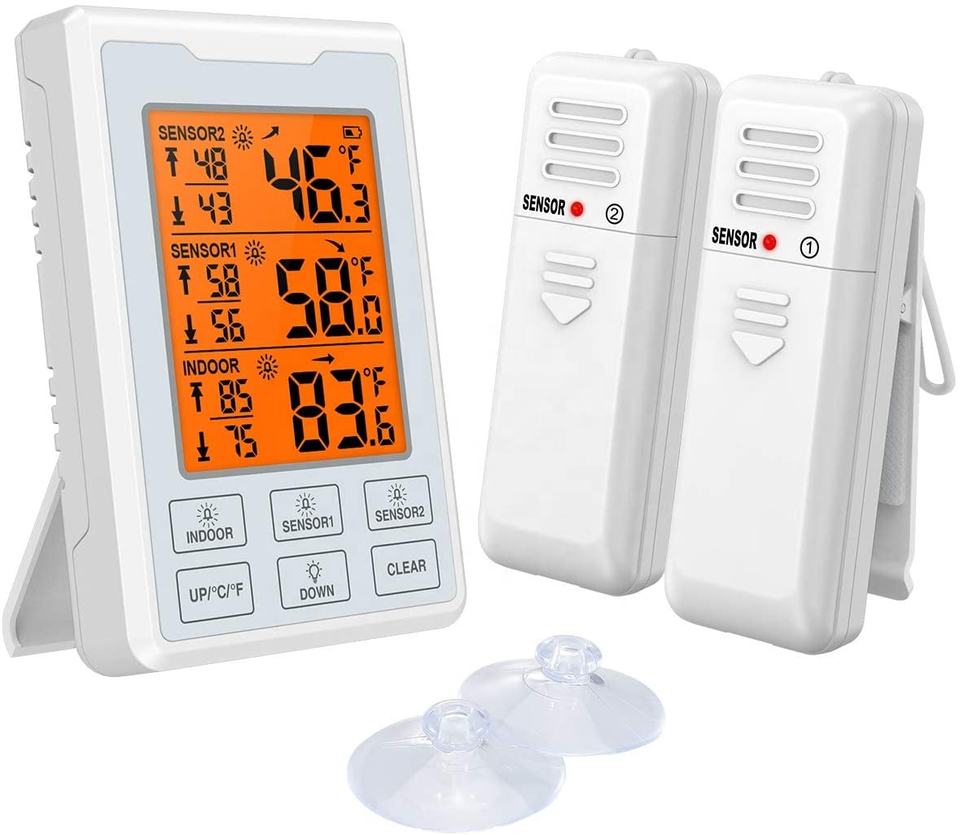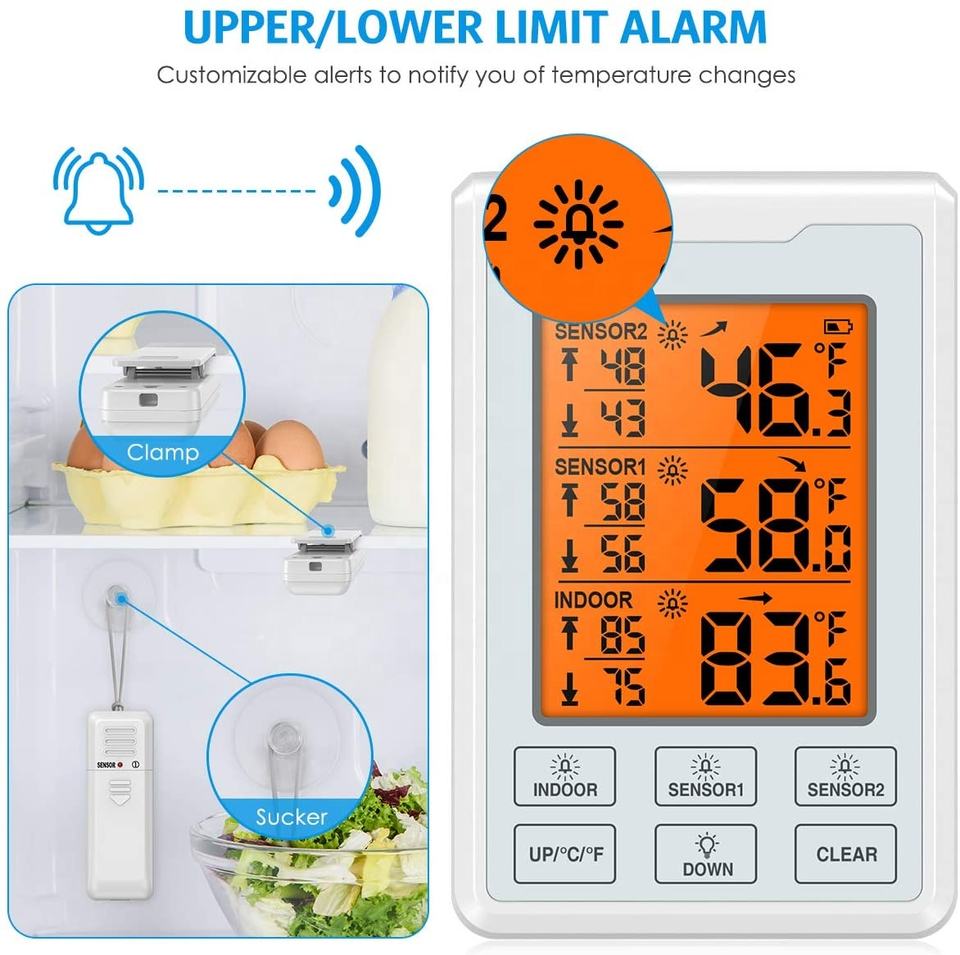 Thermomètre numérique sans fil pour réfrigérateur et congélateur avec 2 capteurs, alarme sonore et rétroéclairage